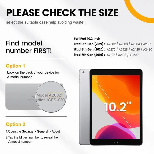 MODEL SPECIFICATIONS: Designed for 10.2 -inch iPad 7th Gen (A2197/A2198/A2200), 8th Gen (A2270/A2428/A2429/A2430), 9th Gen (A2602/A2603/A2604/A2605); Confirm compatibility under Settings > General > Model; Excludes iPad Air/Pro/Mini ^^
