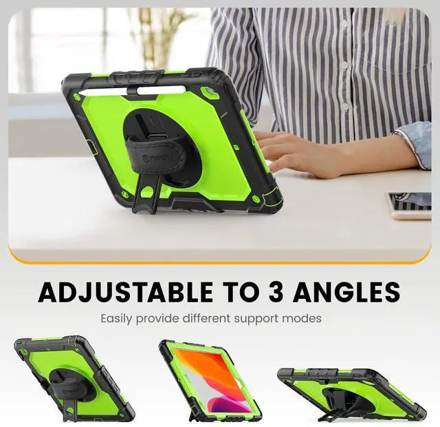 MULTI-ANGLE FUNCTIONALITY: 360 rotating stand with 5 positions for video calls, notes, or viewing; Detachable shoulder strap for commutes; Anti-slip hand strap secures during outdoor work; Dedicated pencil holder for hiking/transport ^^