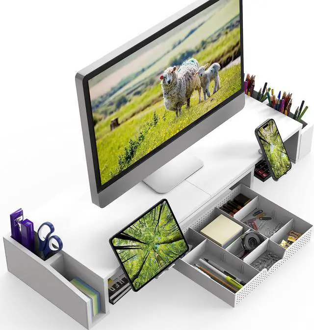 Multi-Functional Monitor Riser / Stand come with a sliding drawer, side caddies and unique ipad/phone holder. Great for printer, computer, laptop, notebook