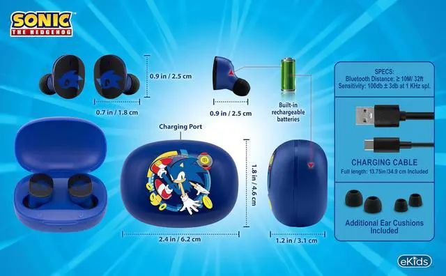 Sonic The Hedgehog Design: Featuring cool Sonic graphics and matching charging case, these Bluetooth earphones have an ergonomic shape that provides lasting comfort. Includes rubber ear cushions in 3 sizes: small, medium, and large.