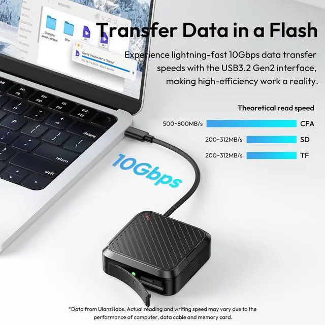 ^^ Ultra-Fast Data Transfer for Maximum Efficiency Equipped with a USB 3.2 Gen2 interface, delivering transfer speeds up to 10Gbps. Integrated with three high-speed chips to support simultaneous reading, writing, and copying across three cards. LED indicators (green for CFA, white for SD/TF) provide real-time feedback, doubling your work efficiency. ^^ Premium Aluminum Alloy Body for Reliable Heat Dissipation Built with a full aluminum alloy casing for effective heat dissipation. Keeps the device cool even during extended use, ensuring stable performance and protecting your storage cards. Designed to prolong the lifespan of your equipment.
