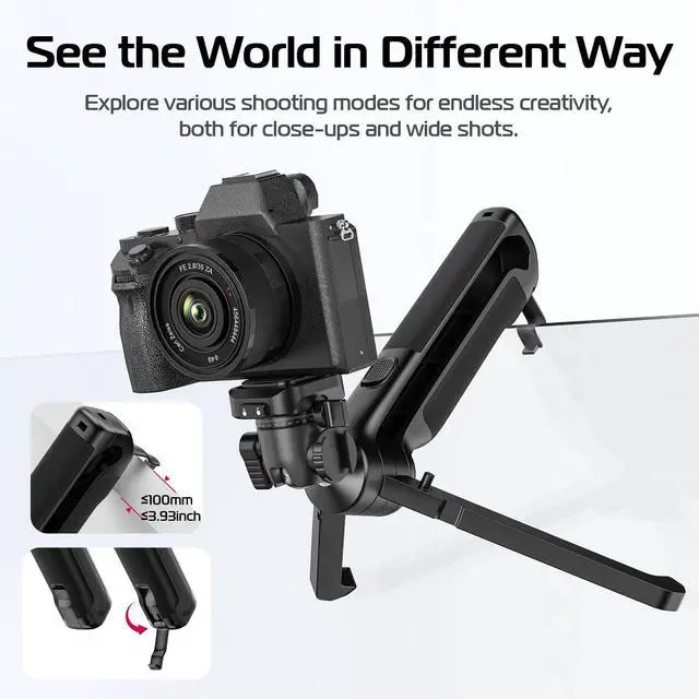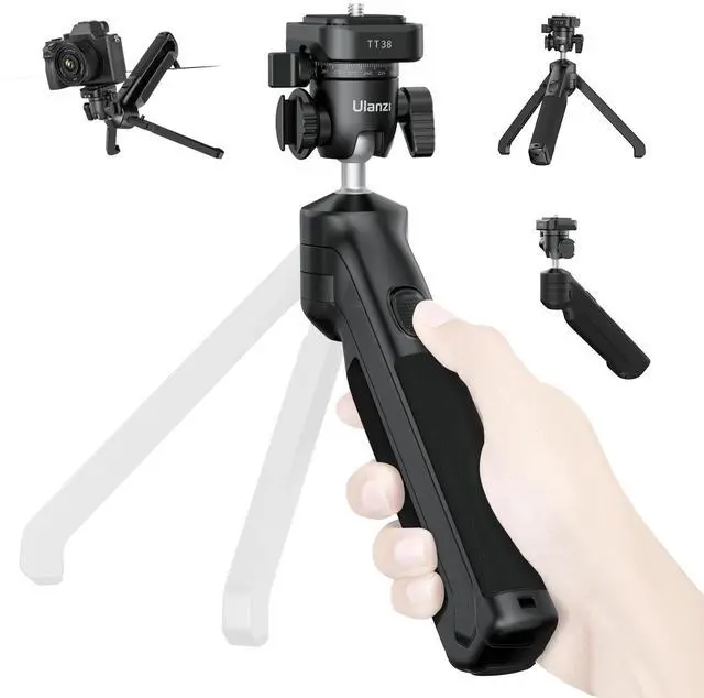Click-to-OpenULANZI TT38 Camera Tripod, Grip to Tripod in a Snap, Seamlessly switch between camera grip and tripod with just a push, never missing a shot. It also has a cold shoe mount on the side for mounting microphones, lights to level up your vlogging, livestreaming. ^^ High QualityThe tripod for camrea has a high load capacity, up to 3KG/ 6.6LBS. Rock-solid triangular structure design supports up to 3KG/ 6.6LBS, ensuring stable footage all the time. Anti-slip silicone pads on the feet ensure stability and prevent slipping. ^^ ULANZI Uka and F38 SystemInstant Setup, Instant Shooting.