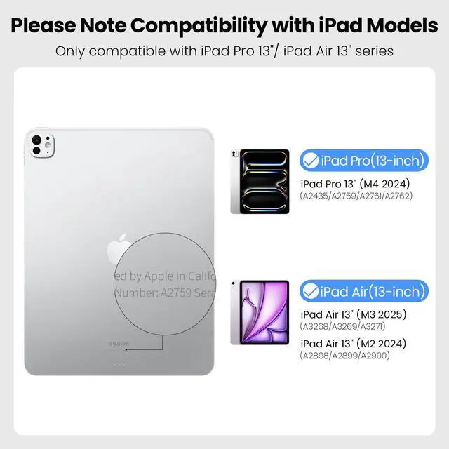 Compatible iPad ModelsOnly compatible with iPad iPad Pro 13 inchM4 2024),iPad Air-13inch(M2 2024) iPad Air 13 inchM3 2025).