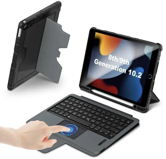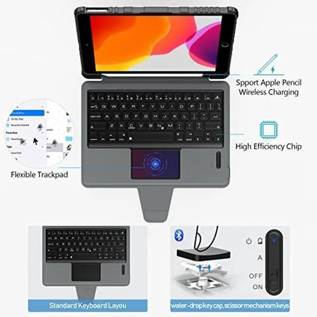 NOTE: Please check the model number on the back of your iPad carefully before order ^^ Comfortable TypingThis iPad keyboard is quiet and the keys are great to type on, shortcut keys and the built-in trackpad for scrolling, swiping ane more. ^^ Detachable Keyboard and Adjustable KickstandDetachable with the case STILL ON, flexible kickstand offers various of angle at your needs. When typing isn't needed, detach the keyboard and enjoy your iPad screen. Stable Stand for you to comfortable switch video, picture, screen writing or using it on your lap ^^ Easy Wireless ConnectivityConnect to ipad easily and the keyboard and trackpad works very well. After 2-3 hours of full charge, the wireless keyboard standby for 90 days. When you close the case or 10 minutes of inactivity, the tablet will auto sleep. ^^ Sturdy keyboard case with Camera Protection CoverSturdy Rugged case with bumper, provides ample protection for the device. The pen holder allows the Apple Pencil to securely charge when not in use.