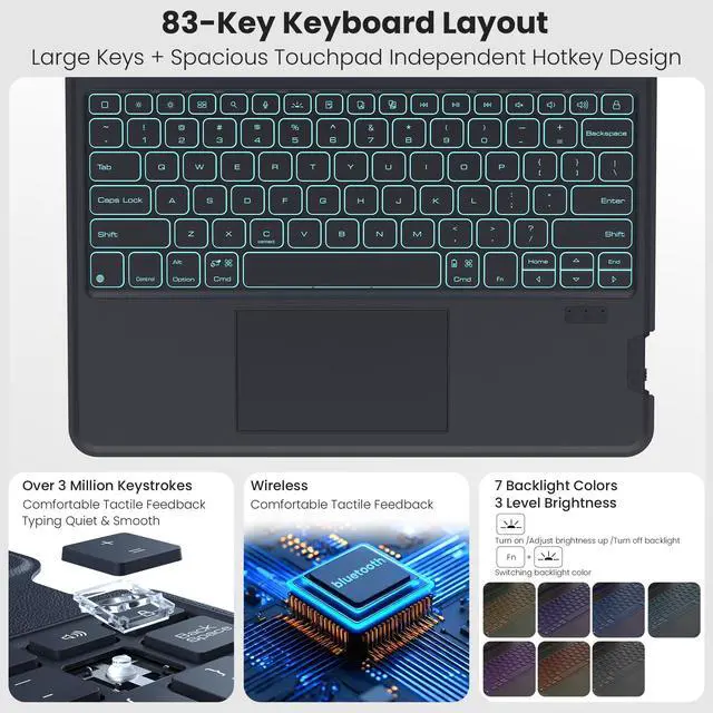 Adjustable 7-Color Backlit Keyboard: This iPad case with keyboard features laser-etched backlit keys that allow 7 vibrant colors to shine in the dark, with 3 adjustable brightness levels for fun and effortless typing in low light. The full-size ergonomic scissor-switch keys offer responsive feedback and reduced noise, ensuring comfortable typing even during extended use.
