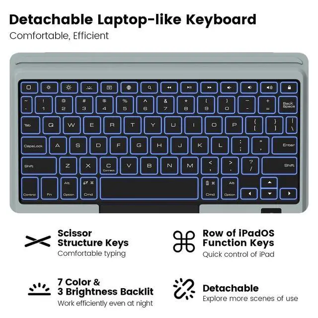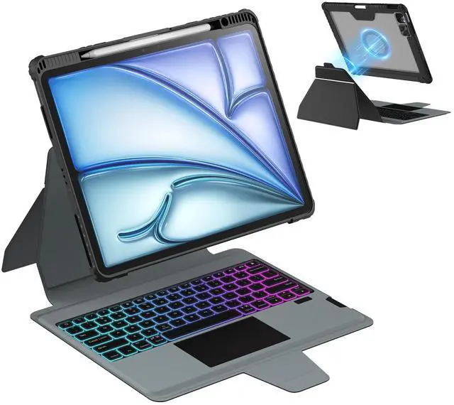 The keyboard features 7 color options and 3 levels of backlit brightness, making it possible to work efficiently even in dark environments. ^^ Magical Trackpad - The sensitive trackpad allows for precise taps, supports all iPadOS Multi-Touch gestures such as scroll, zoom and drag. Multitask, edit, and browse without touching the screen, significantly improving efficiency. With palm rejection technology, your typing won't be interrupted. ^^ Outstanding Battery Life - With a standby time of up to 180 days and 100 hours of use on a full charge, the keyboard supports long-term outdoor work and business trips. It features auto sleep/wake functionality and uses the same Type-C charging port as the iPad. Additionally, an easy-access holder securely stores the Apple Pencil while it is charging, making it convenient to take out and use.