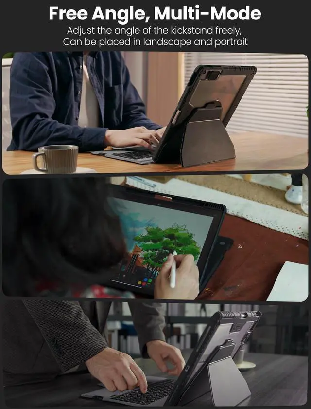 NOTE: NOT FIT FOR IPAD PRO 11 (M4). ^^ Switch usage scenarios freely - The kickstand offers adjustment from 0 to 180, can be placed in landscape or portrait, stable and durable, you can find the perfect angle for working, creating, browsing, taking notes or drawing. The keyboard can be easily detached, with the exclusive magnetic ring design, your iPad can be attached to any iron surface, and with the Nillkin SnapHold magnetic ring (sold separately), you can mount your iPad anywhere to explore more usage scenarios. (The magnetic ring does not fit Magsafe) ^^ Tough Protective Case - The heavy-duty thickened TPU frame and PC back, combined with a corner shockproof design, provide full-body military-grade rugged protection for your iPad, safeguarding it from bumps or drops. The surface covered with high quality faux leather, stain-resistant and wear-resistant. Unique sliding camera cover protects the lens while keeping your privacy. ^^ Detachable Backlit Keyboard - Clear key feedback offers a laptop-like responsive and comfortable typing experience. A full row of function keys, support for iPadOS shortcuts for quick editing of documents, programming, photo editing or video editing, maximizing your productivity.