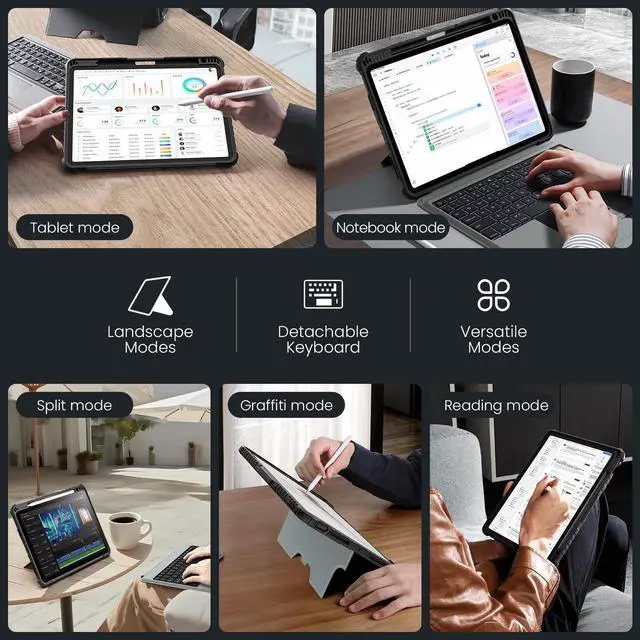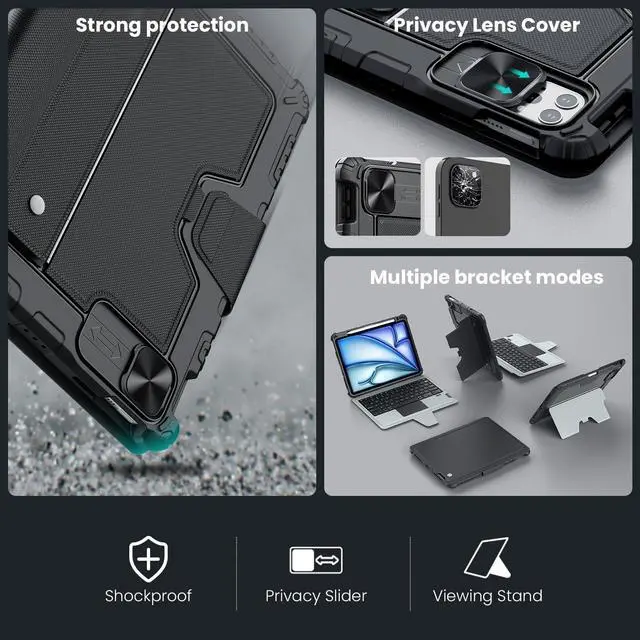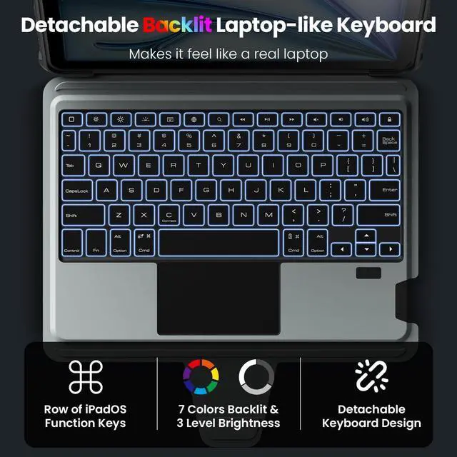 NOTE: NOT FIT FOR IPAD PRO 11 (M4) ^^ Detachable Backlit Keyboard with iPadOS Shortcuts - Enjoy laptop-grade responsive typing with clear key feedback and full-row function keys, supporting iPadOS shortcuts for document editing, programming, and photo/video editing. 7 backlight colors & 3 brightness levels enable efficient work even in low-light environments. ^^ Military-Grade Rugged Protection - The heavy-duty thickened TPU frame and PC back, combined with a corner shockproof design, provide full-body military-grade superb protection for your iPad, safeguarding it from bumps or drops. surface covered with high quality faux leather, stain-resistant and wear-resistant. Unique sliding camera cover protects the lens while keeping your privacy ^^ Precision Trackpad with Palm Rejection - The sensitive trackpad supports all iPadOS Multi-Touch gestures (scroll/zoom/drag) for seamless multitaskingno need to touch the screen. Built-in palm rejection technology prevents accidental taps and ensures uninterrupted typing ^^ Free-Angle Multi-Mode Kickstand - Adjustable kickstand (110180) works for landscape/portrait mode, stable and durable for working, creating, browsing or note-taking. Detach the keyboard effortlessly to enjoy drawing or hands-free reading ^^ Outstanding Battery Life & Pencil Holder - Boasts up to 180-day standby time and 100-hour continuous use on a full chargeperfect for long business trips or outdoor work.