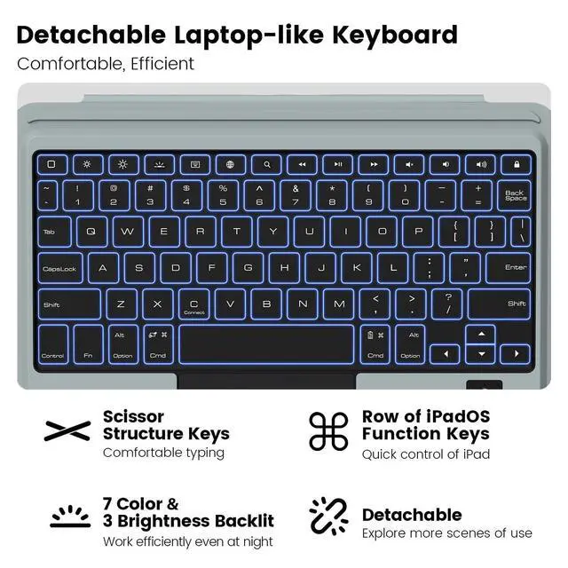 The keyboard features 7 color options and 3 levels of backlit brightness, making it possible to work efficiently even in dark environments ^^ Magical Trackpad - The sensitive trackpad allows for precise taps, supports all iPadOS Multi-Touch gestures such as scroll, zoom and drag. Multitask, edit, and browse without touching the screen, significantly improving efficiency. With palm rejection technology, your typing won't be interrupted. ^^ Tough Protective Case - The heavy-duty thickened TPU frame and PC back, combined with a corner shockproof design, provide full-body military-grade superb protection for your iPad, safeguarding it from bumps or drops.