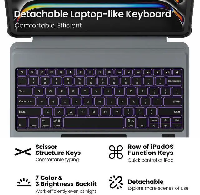 The keyboard features 7 color options and 3 levels of backlit brightness, making it possible to work efficiently even in dark environments. ^^ Magical Trackpad - The sensitive trackpad allows for precise taps, supports all iPadOS Multi-Touch gestures such as scroll, zoom and drag. Multitask, edit, and browse without touching the screen, significantly improving efficiency. With palm rejection technology, your typing won't be interrupted. ^^ Tough Protective Case - The heavy-duty thickened TPU frame and PC back, combined with a corner shockproof design, provide full-body military-grade superb protection for your iPad, safeguarding it from bumps or drops.