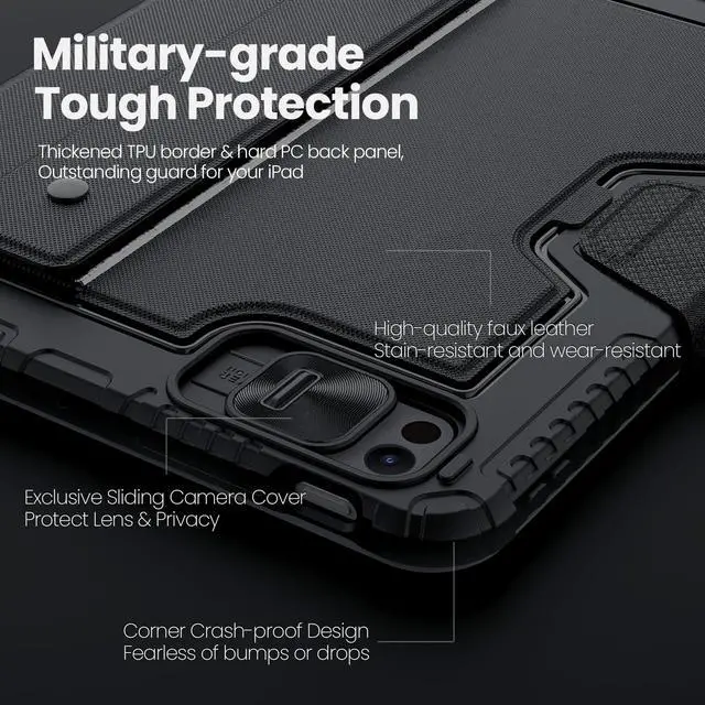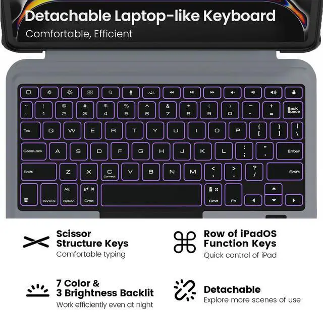 The keyboard features 7 color options and 3 levels of backlit brightness, making it possible to work efficiently even in dark environments. ^^ Magical Trackpad - The sensitive trackpad allows for precise taps, supports all iPadOS Multi-Touch gestures such as scroll, zoom and drag. Multitask, edit, and browse without touching the screen, significantly improving efficiency. With palm rejection technology, your typing won't be interrupted. ^^ Tough Protective Case - The heavy-duty thickened TPU frame and PC back, combined with a corner shockproof design, provide full-body military-grade superb protection for your iPad, safeguarding it from bumps or drops.