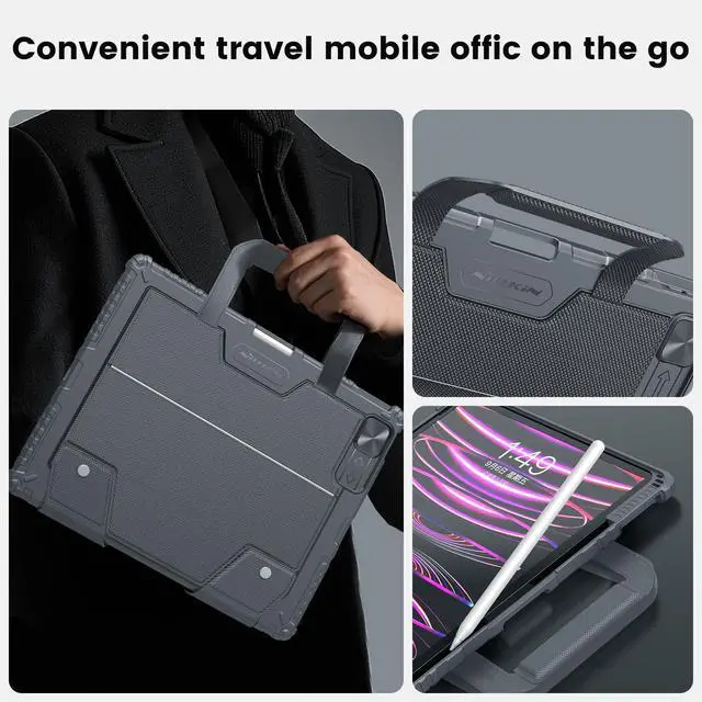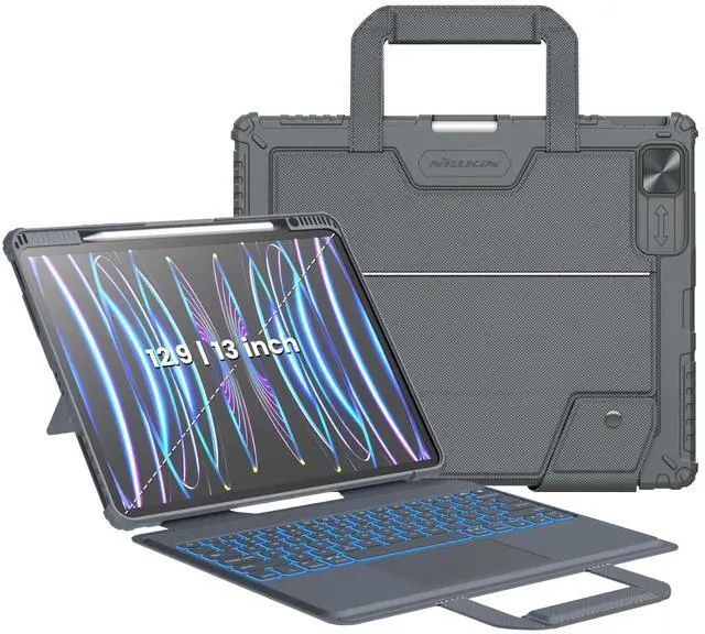 Detail Model: For iPad Pro 12.9 6th Generation 2022 (A2764/A2437/A2766) /5th Generation 2021(A2378/A2379/A2461/A2462)/ 4th Generation 2020 (A2229/A2069/A2232/A2233) 3rd Generation 2018(A1876/A2014/A1895/A1983) ^^ Backlit Keyboard Case with Easy Carry Go HandleComfortable Typing, The keys are great to type on for this Nillkin iPad keyboard. Shortcut keys and the built-in track pad for scrolling, swiping. Backlit Keyboard design is very eyes friendly. Durable PU leather Keyboard Bag Handle for easy to carry and go in Work Trip or Dairy Carry. ^^ Detachable Keyboard and Adjustable KickstandDetachable while the case STILL ON, flexible kickstand offers various of angle at your needs. When typing isn't needed, detach the keyboard. Stable Stand for you to comfortable used while watching video or picture, screen writing or using it on your lap. ^^ Easy Bluetooth ConnectionConnect to iPad easily. Keyboard and track pad work very well. After 2-3 hours of full charge, the wireless keyboard standby for 90 days. When you close the case or 10 minutes of inactivity, the tablet will auto sleep.