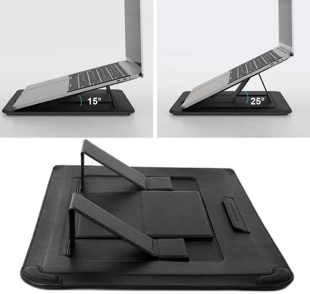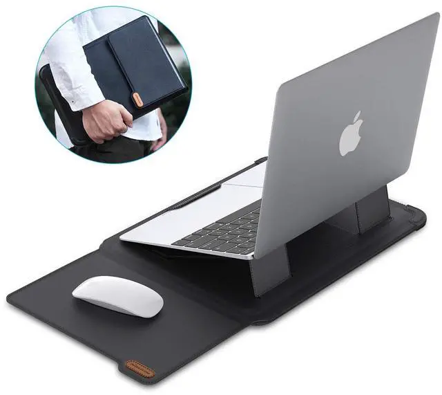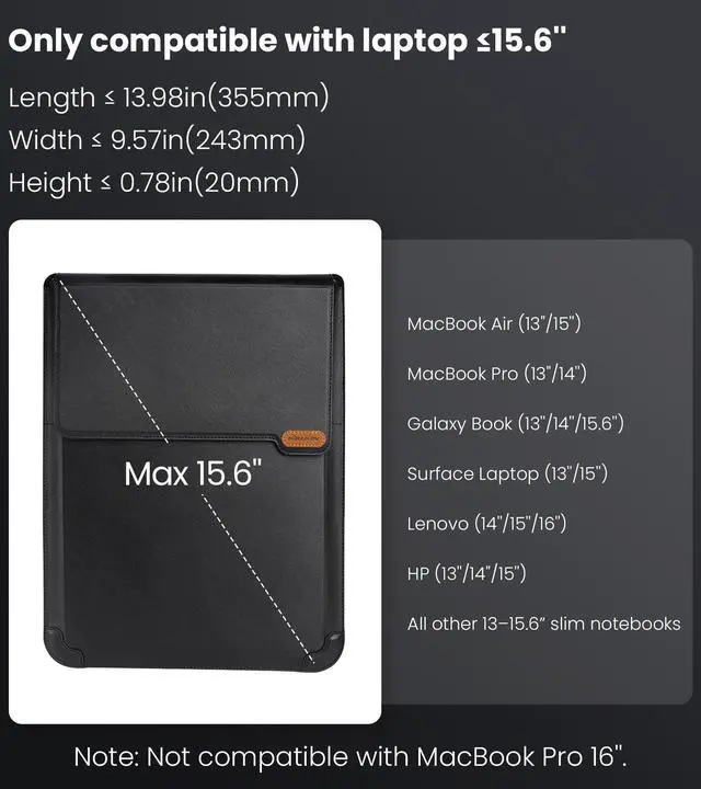 External dimensions: 14.7611. 141.01 inch (L x W x H); Only compatible with lightweight laptops ranging from 13- 15.6 inches, such as Apple MacBook Air, Chromebook, Surface, Samsung, etc. Please note that some 15.6 -16 inch gaming laptops, engineering laptops or MarBook Pro 16'' are not compatible. Check your laptops size before purchase not for models smaller than 14.099. 840.78 inch (LWH) ^^ [3 in 1 Function] - Laptop Stand, Laptop sleeve and mouse pad 3 in 1 function. Ability to use closing flap as a Mouse pad, Stand folding design and convenience to go out, compact and light, sleek appearance ^^ [Adjustable Laptop Stand] - 2 Adjustable Angles and Ergonomic Design, It is sturdy and provides your laptop with good ventilation, Good heat dissipation function, Provide your wrists with a great angle for typing, and protect your neck and shoulders from pain ^^ [Premium Material] - Crafted from high-quality PU leather, it boasts a premium tactile feel. The interior features a soft flannel lining paired with shock-absorbing sponge padding, effectively shielding your notebook from scratches, impacts, and other potential damage ^^ [Ultra-Slim & Lightweight] - its effortless to carry on the go.