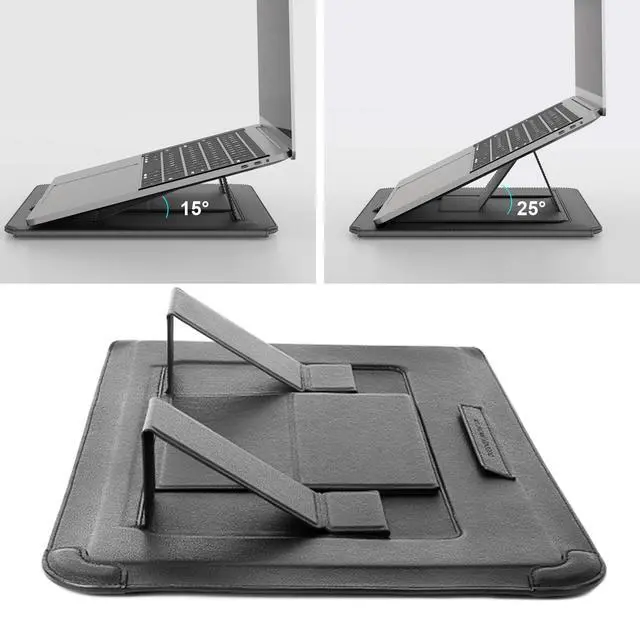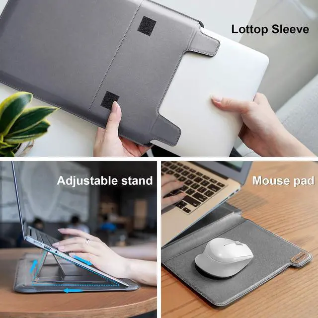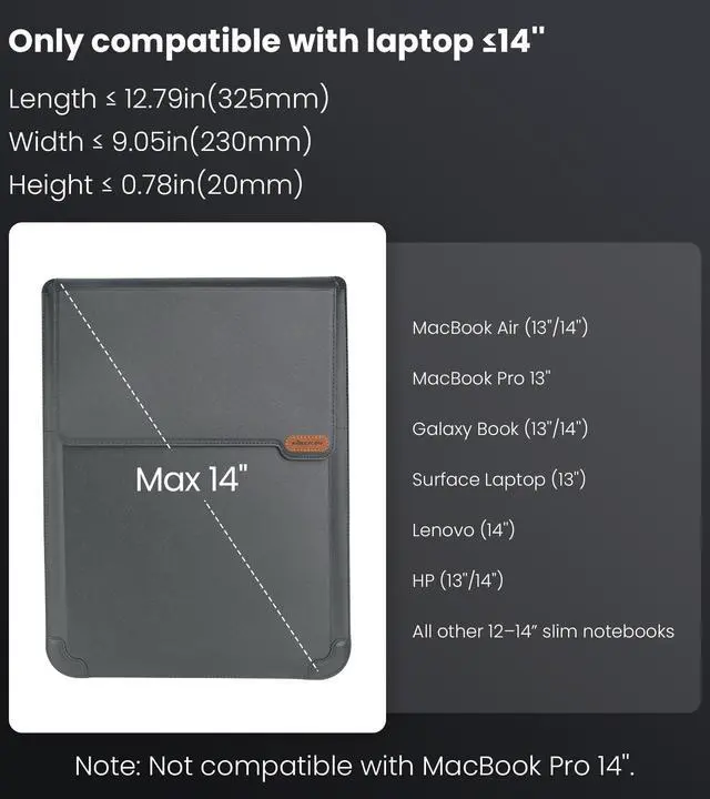 External dimensions: 13.859. 960.88 inch (L x W x H); Only compatible with lightweight laptops ranging from 12-14 inches, such as Apple MacBook Air, Chromebook, Surface, Samsung, etc. Please note that some 14 inch gaming laptops, engineering laptops or MarBook Pro 14'' are not compatible. Check your laptops size before purchase not for models smaller than 12.799. 050.78 inch (LWH) ^^ [3 in 1 Function] - Laptop Stand, Laptop sleeve and mouse pad 3 in 1 function. Ability to use closing flap as a Mouse pad, Stand folding design and convenience to go out, compact and light, sleek appearance ^^ [Adjustable Laptop Stand] - 2 Adjustable Angles and Ergonomic Design, It is sturdy and provides your laptop with good ventilation, Good heat dissipation function, Provide your wrists with a great angle for typing, and protect your neck and shoulders from pain ^^ [Premium Material] - Crafted from high-quality PU leather, it boasts a premium tactile feel. The interior features a soft flannel lining paired with shock-absorbing sponge padding, effectively shielding your notebook from scratches, impacts, and other potential damage ^^ [Ultra-slim & Lightweight] - its effortless to carry on the go.