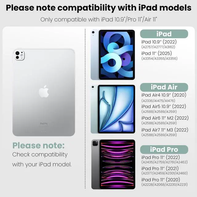 Compatibility: Please confirm your iPad model is compatible before purchase. The Nillkin Keyboard Case supports iPad 11th Gen 2025 (A3354/A3355/A3356); iPad 10th Gen 10.9 -inch 2022 (A2696/A2757/A2777/A3162); iPad Air 11-inch (A2902/A2903/A2904/A3266/A3267/A3270); iPad Air 10.9 -inch (A2589/A2591/A2588/A2316/A1475/A1476); and iPad Pro 11-inch (A2228/A2068/A2230/A2231/A2377/A2459/A2301/A2460/A2759/A2435/A2761/A2462). ^^