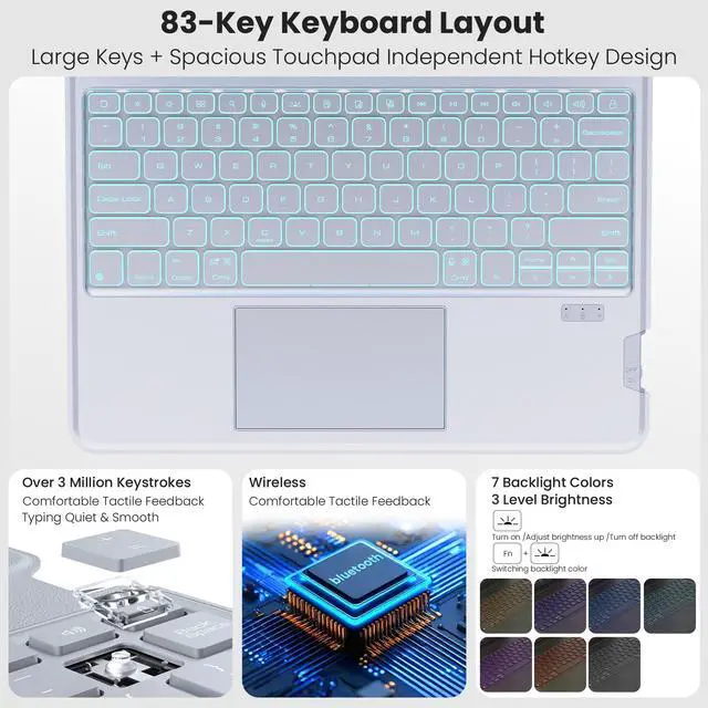 Adjustable 7-Color Backlit Keyboard: This iPad case with keyboard features laser-etched backlit keys that allow 7 vibrant colors to shine in the dark, with 3 adjustable brightness levels for fun and effortless typing in low light. The full-size ergonomic scissor-switch keys offer responsive feedback and reduced noise, ensuring comfortable typing even during extended use.