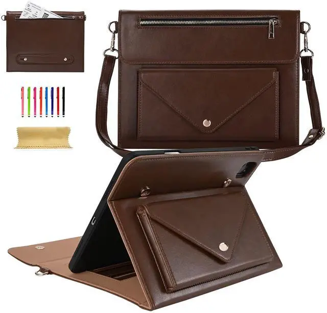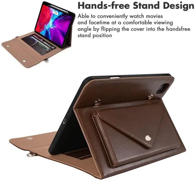 Dteck for iPad Pro 11-Inch M4 Folio Case 2024 Release with Shoulder Strap, Built-in Pencil Holder/Pockets/Card Cash Slots, Button Closure, PU Leather Protective Fold Stand Cover for Men Women, Coffee