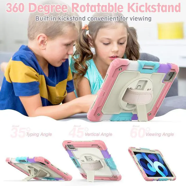 On the back side of iPad Air 5th 10.9 inch Case, built-in kickstand can supports your tablet both in horizontal/vertical position and hand strap makes it easy for you to hold the iPad