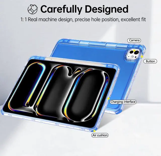 Compatible with iPad Pro 13" (M4) 2024 release & iPad Air 13" (M3/M2) 2025/2024 release & iPad Pro 12.9" (2022/2021/2020/2018 release)Built-in pencil holder slot, charge the pencil easily without removing case and easy access to the pencil whenever you need itShock-absorbing protection with a slim and stylish profile4 reinforced corners for added drop resistanceClear back to showcase the tablet's designEasy access to buttons and ports without removing casePackage