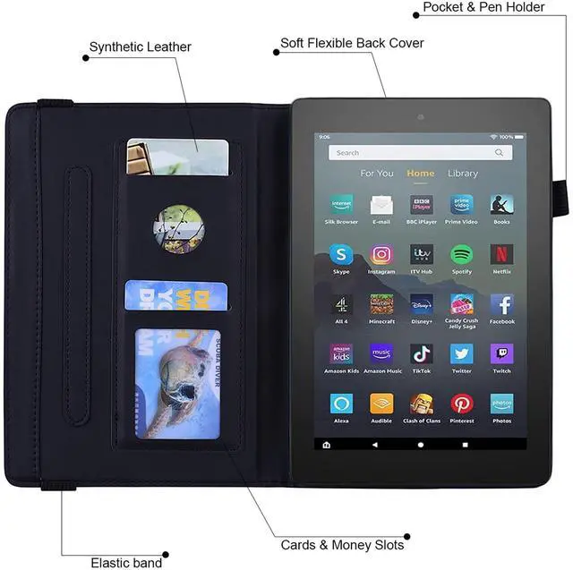 Feature: * Multi-Angle Viewing Stand Cover has two viewing angles. * Made of premium synthetic leather exterior, soft TPU back cover and microfiber interior. * Case allows access to charge all ports and speakers, perfectly for Kindle Fire 7 2022. * Flip wallet cover has two card pockets, which is convenient to store credit cards/ ID cards/ bank cards, etc. * With pencil holder, protective case is convenient to carry the touch screen pen with you to avoid losing it.