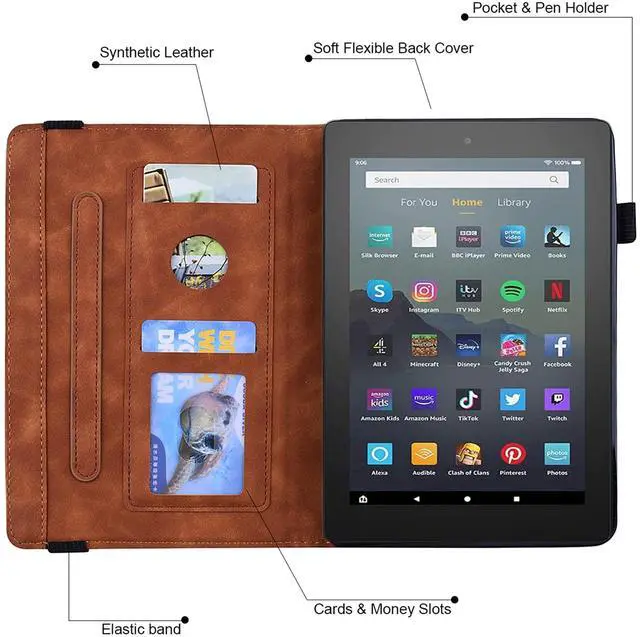 Feature: * Multi-Angle Viewing Stand Cover has two viewing angles. * Made of premium synthetic leather exterior, soft TPU back cover and microfiber interior. * Case allows access to charge all ports and speakers, perfectly for Kindle Fire 7 2022. * Flip wallet cover has two card pockets, which is convenient to store credit cards/ ID cards/ bank cards, etc. * With pencil holder, protective case is convenient to carry the touch screen pen with you to avoid losing it.