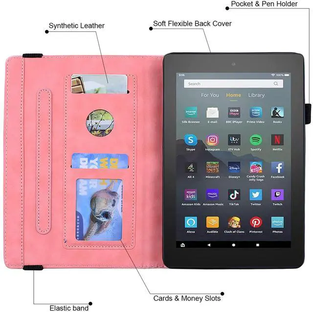 Feature: * Multi-Angle Viewing Stand Cover has two viewing angles. * Made of premium synthetic leather exterior, soft TPU back cover and microfiber interior. * Case allows access to charge all ports and speakers, perfectly for Kindle Fire 7 2022. * Flip wallet cover has two card pockets, which is convenient to store credit cards/ ID cards/ bank cards, etc. * With pencil holder, protective case is convenient to carry the touch screen pen with you to avoid losing it.