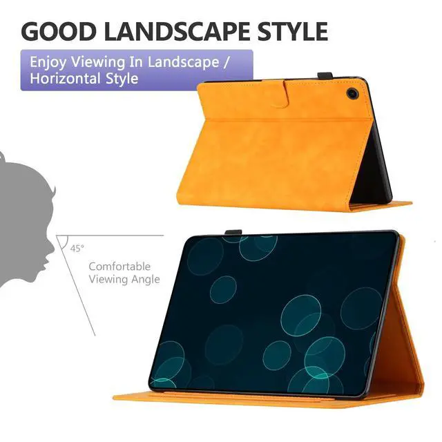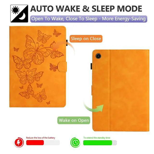 Features: premium folio case is made from soft silicone & scratch resistant faux leather material, slim fit and lightweight. protective fold case, easy to put on and take off, one piece case, cannot separate. pen loop is a convenient accessory that allows you to easily keep your stylus or pen close at hand while using your tablet. built-in slots to hold credit cards, ID cards, or other small items, offers added convenience for carrying essential items along with your tablet. built-in stand allows for hands-free viewing of your tablet screen, great for watching movies, video chatting, or following a recipe while cooking. flip case with auto wake sleep functionality allows the device to automatically enter sleep mode when the case is closed and wake up when it is opened. cute butterfly cartoon design, vibrant colors, stylish multi-functional tablet case for women/men/girls/boys. many colors to choose from, black/red/brown/green/purple/yellow.