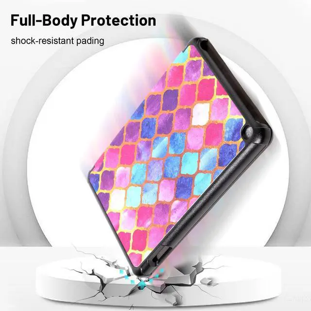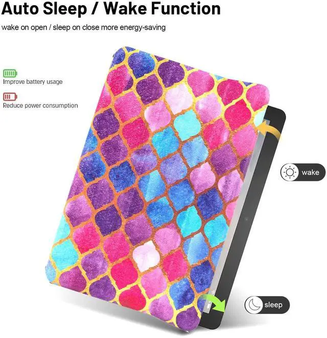 • Auto Wake/SleepBuilt-in magnetic strip provides sleep / wake feature, automatically wakes or puts your device to sleep. Available in a variety of bright and Fun pattern.