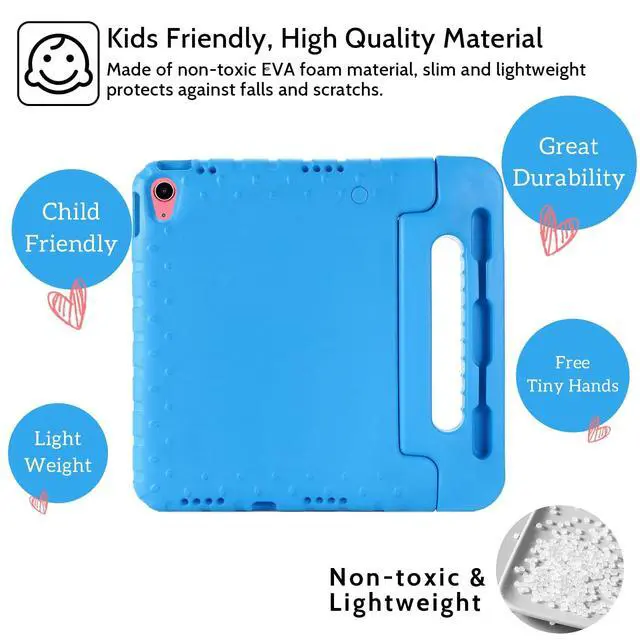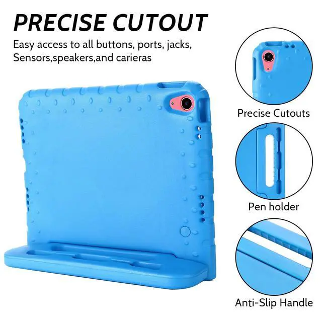 (Model: A2757/A2777/A2696). Please check your iPad model number on the back before purchasing. Precise cutout, easy for operationRaised screen bezel protects glass from breaking & shattering on frontal impact. Precise cut-outs for charging port, speakers, cameras, earphone, volume and power buttons, allows you easy access to all features without removing the case. For iPad 10th generation 10.9 tablet Case with Pencil HolderBuilt-in Apple Pencil holder tightly holding your Apple pencil and easy to put in and the middle bareness part design of the holder allowing to pull your pencil out easilySafety/Lightweight DesignSlim and lightweight design adds minimal bulk while offering your device great protection. Made from durable, lightweight, kid-safe and shock-resistant eva foam that it fully covers the back, sides and extend the surface of the iPad 10.9 Inch 2022 screen, safely protects your ipad 10.9" against bumps and drops. Its soft foamy exterior makes it ultra child-friendly. Made of EVA Material, easy to clean. Portable Adjustable Handle Converts into Stand for Movies or TypingAnti-slip large handle is designed for comfortable one handed grip for iPad 10th Generation Kids CaseSuper lightweight so your child can carry the iPad 10th Generation 2022 case to play at school and home easily.