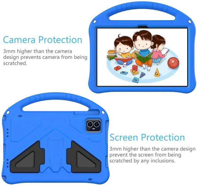 Flat lay: typing keyboard mode. Raised screen bezel protects glass from breaking & shattering on frontal impact. Precise cut-outs for charging port, speakers, cameras, earphone, volume and power buttons, allows you easy access to all features without removing the case. Slim and lightweight design adds minimal bulk while offering your device great protection. So your child can carry the Onn 10.1 Tablet Case (2024) Model#100135925 case to play at school and home easily. Made from durable, lightweight, kid-safe and shock-resistant eva foam that it fully covers the back, sides and extend the surface of the Onn 10.1 inch Tablet 2024 screen, safely protects your Onn 10.1" 4Gen against bumps and drops. Its soft foamy exterior makes it ultra child-friendly. Made of EVA Material, easy to clean. Package List1 x Dteck Case for Onn 10.1 Gen 4 Tablet 2024 1 x Cleaning Cloth; 1 x Random Color Stylus Pen;