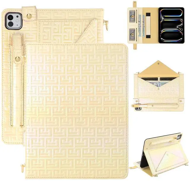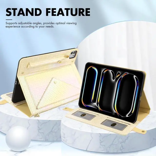 ^^ [Convenient Strap]: Shockproof case for iPad pro 11" (M4/M5) with an adjustable, detachable shoulder strap allows you to easily carry your device as a tablet bag or crossbody case. Snug fits and offers precise cutouts for the camera, speakers, and ports. Cute folio case with a glitter gradient finish for women, girls.