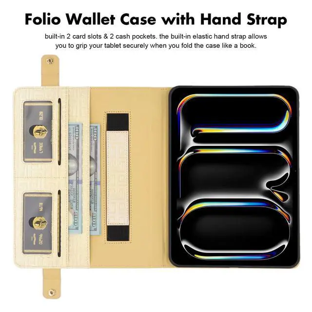 Hand Strap]: Multifunctional shimmering gradient foldable folio case for iPad pro 11" (M4/M5) with stand, allows you easily propping device up for hands-free ciewing in landscape mode, easy to read, video call, or watch movies. The elastic hand strap allows you to hold your tablet securely with one hand when you fold the folio case on back.