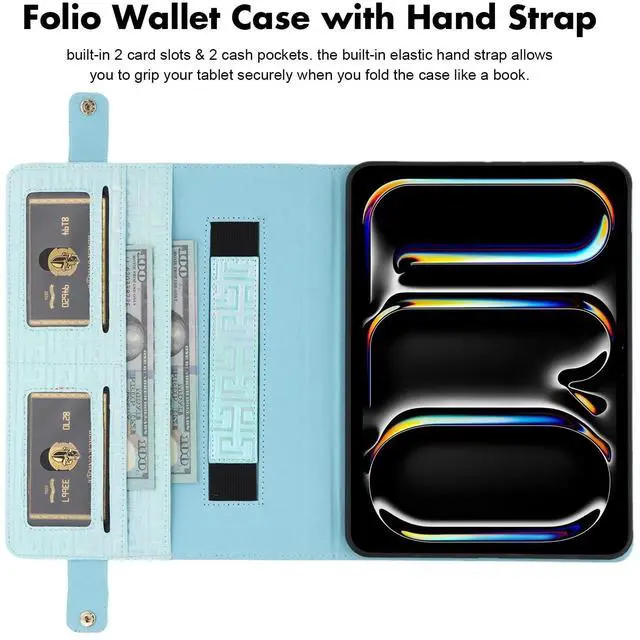 Hand Strap]: Multifunctional shimmering gradient foldable folio case for iPad pro 11" (M4/M5) with stand, allows you easily propping device up for hands-free ciewing in landscape mode, easy to read, video call, or watch movies. The elastic hand strap allows you to hold your tablet securely with one hand when you fold the folio case on back.