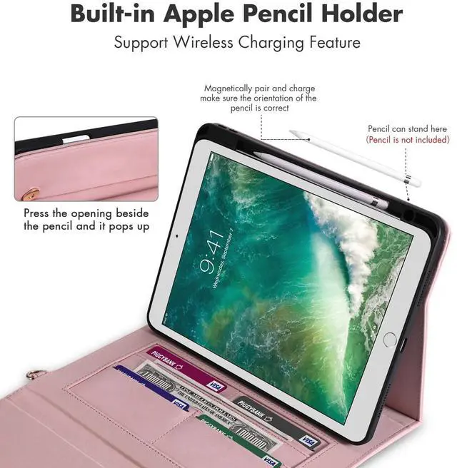 Number: A2197/A2198/A2200)Premium PU Leather, Provide Better ProtectionThe case sports a simple and classy design made from premium synthetic leather exterior and soft microfiber interior lining to provide perfect protection for your tablet against accidental drops, scratches, shocks and dust or any other daily damage. With hidden magnets, makes it easy for you to open and close your tablet. Stand at Multiple AnglesAble to set up multiple horizontal stand angles for watching movie or typing. Free your hands, convenient for face-time, watching videos. Built-in Pencil HolderSupports the iPad Pencil attached magnetically for pair and Wireless charge on your iPad 10.2 inch, without taking off the case. You can grab your Apple Pencil effortlessly whenever you want, easily to carry your the pencil with your device (Apple Pencil Not included). Large CapacityThe tablet Case includes card slots inside, 2 zipper pocket, 1 magnetic bag outside which has 1 detachable small cards bag, which can satisfied your daily necessary requirement to carry cards, some cash, key, pencil, earphones, charging cable and other little things. Shoulder Strap + Hand Strap CaseCase with Adjustable and Detachable Shoulder Strap.