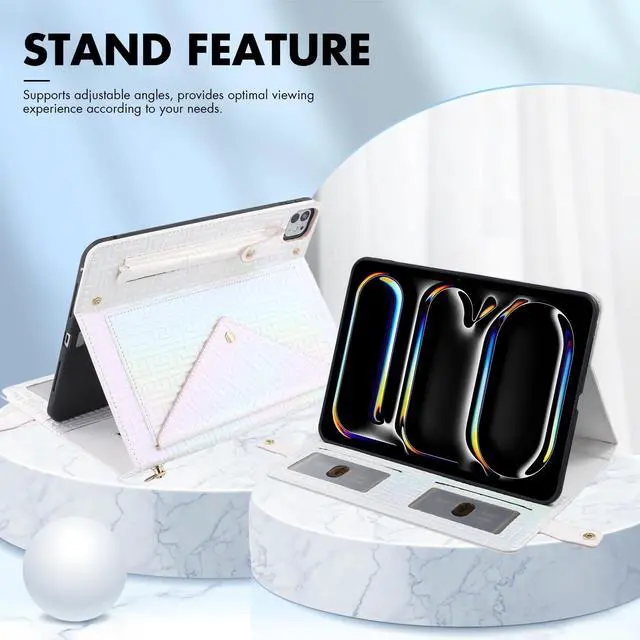^^ [Convenient Strap]: Shockproof case for iPad pro 11" (M4/M5) with an adjustable, detachable shoulder strap allows you to easily carry your device as a tablet bag or crossbody case. Snug fits and offers precise cutouts for the camera, speakers, and ports. Cute folio case with a glitter gradient finish for women, girls.
