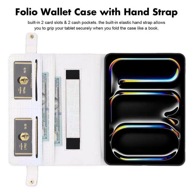 Hand Strap]: Multifunctional shimmering gradient foldable folio case for iPad pro 11" (M4/M5) with stand, allows you easily propping device up for hands-free ciewing in landscape mode, easy to read, video call, or watch movies. The elastic hand strap allows you to hold your tablet securely with one hand when you fold the folio case on back.