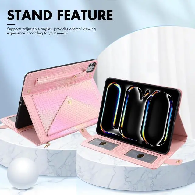 ^^ [Convenient Strap]: Shockproof case for iPad pro 11" (M4/M5) with an adjustable, detachable shoulder strap allows you to easily carry your device as a tablet bag or crossbody case. Snug fits and offers precise cutouts for the camera, speakers, and ports. Cute folio case with a glitter gradient finish for women, girls.