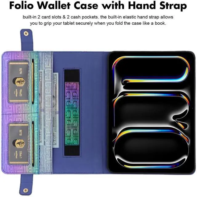 Hand Strap]: Multifunctional shimmering gradient foldable folio case for iPad pro 11" (M4/M5) with stand, allows you easily propping device up for hands-free ciewing in landscape mode, easy to read, video call, or watch movies. The elastic hand strap allows you to hold your tablet securely with one hand when you fold the folio case on back.