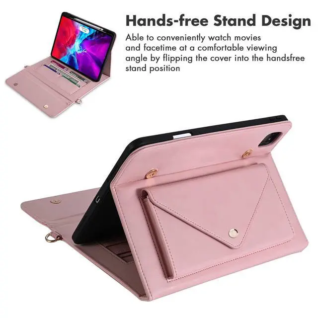 ^^ [Convenient Strap]: Protable case for iPad pro 11" (M4/M5) with an adjustable, detachable shoulder strap allows you to easily carry your device as a tablet bag or crossbody case. Built-in a hand strap on back to provide added grip. Fold stand case, hands-free viewing in landscape mode, easy to watch videos, read, or video call.