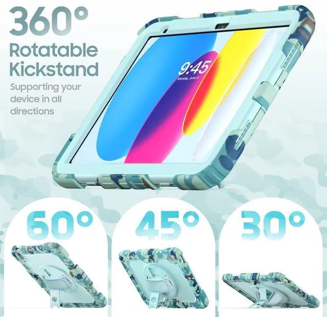 ^^ [Built-in Rotating Kickstand]: This rugged case for iPad A16 11" and iPad 10.9" (10th generation) with a hidden kickstand allows you to easily prop up your device at different angels, its rotatable design enables hands-free viewing in landscape or portrait modes, perfect for watching a movie, video call, studying, or reading. ^^ [Built-in