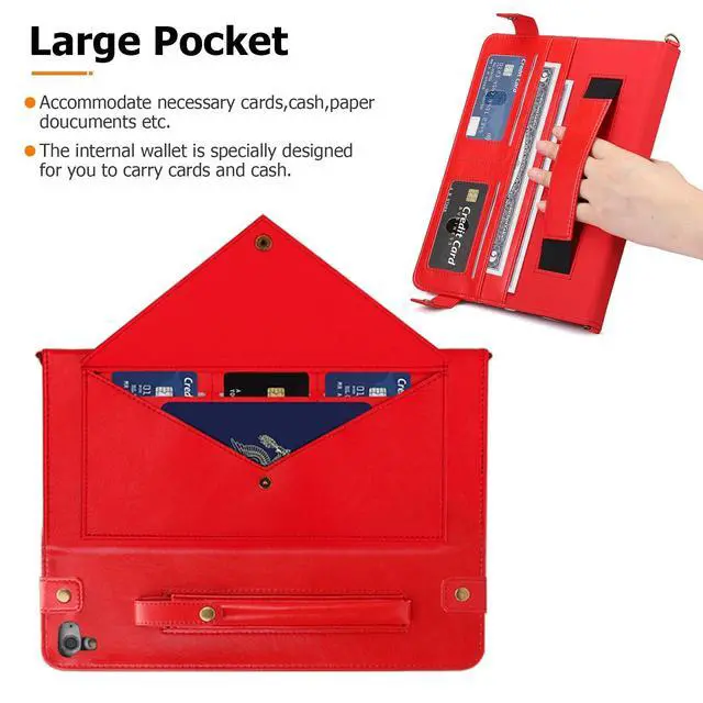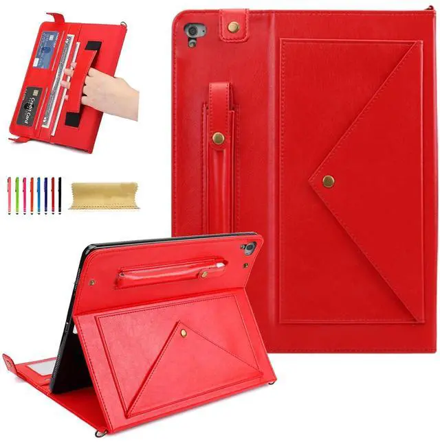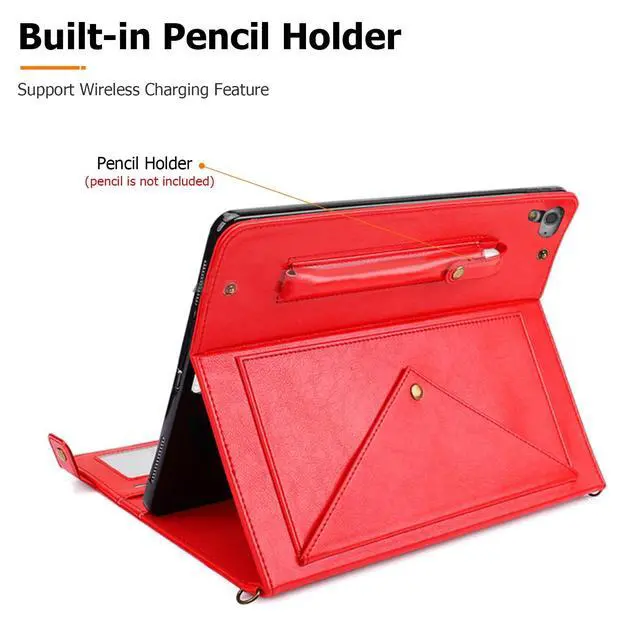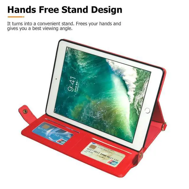 (Model: A1893/A1954/A1822/A1823). Not fit any other model. Please check your iPad model before purchasing. ^^ Comprehensive Protection --- Premium synthetic PU leather exterior, and soft interior lining to protect your iPad 9.7 inch 2018 from scratches, impacts, dust or any other daily damage. Easy and quick access to all the buttons. ^^ Auto Wake/SleepAutomatically wakes or puts your iPad 5th gen 2017 to sleep when the lid is opened and closed (only when the function of your tablet turned on). ^^ Supports S Pen Wireless Charging--- The S Pen can be magnetically attached to the back of your iPad Air 2 without obstacles, and supports S Pen wireless charging. With an pen holder on the back, you can carry the S Pen at any time to avoid losing it. (S Pen is NOT included) ^^ Multi-Function - Hand Strap & Should Strap & Wallet & Document Pockets --- Built-in PU leather hand strap (one-handed operation), multiple horizontal bracket angles for comfortable watching movie or typing. Features document card pocket to keep notes, cash, cards. Also comes with a removable and adjustable shoulder strap for carrying, providing convenience for you while travelling or business trip.