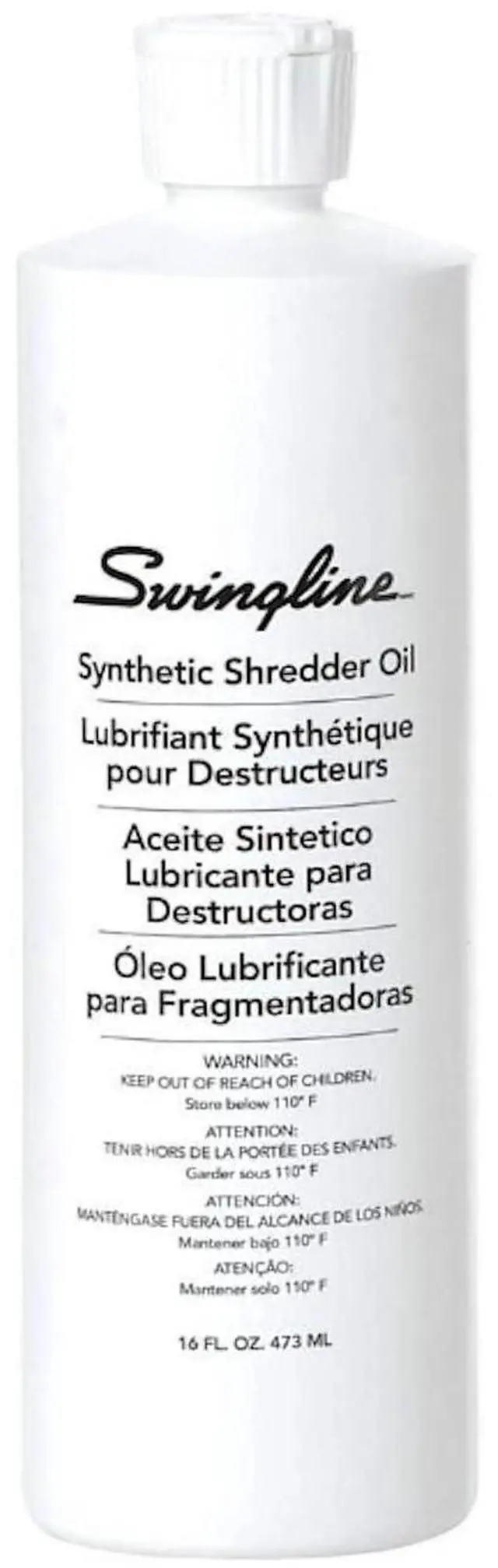 Swingline Synthetic Shredder Oil View larger Oiling cutters regularly is essential to shredding performance. Swingline shredder oil is specifically designed to lubricate the cutters in your shredder. Swingline oil is synthetic and will not cause build-up on any shredder parts. The cutters of a well-oiled shredder require less torque to shred effectively. As a result, the cutters move freely and easily to power through the maximum document capacity of any particular shredder model. Protect your investment and extend the life of your shredder with regular use of Swingline shredder oil. Swingline synthetic shredder oil can safely be used to lubricate the cutters on any shredder, regardless of the manufacturer.
