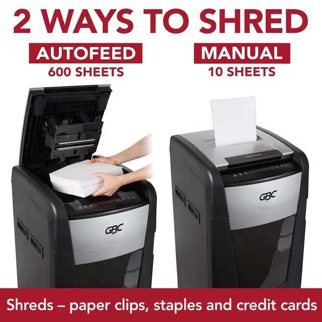 Spend less time shredding and more time on other tasks with the GBC AutoFeed+ 600M Micro-Cut Shredder. Our innovative auto-feeding technology takes the manual work out of shredding. Simply stack, shut and walk away. The shredder will shred your papers while you focus on your next project. Stack up to 600 sheets in the feeder for hands-free automatic shredding, or shred up to 10 sheets at once using the manual feeder slot. This shredder uses a micro-cut style shred, which provides P-5 Level Security. It safely shreds confidential or sensitive information, giving you peace of mind.
