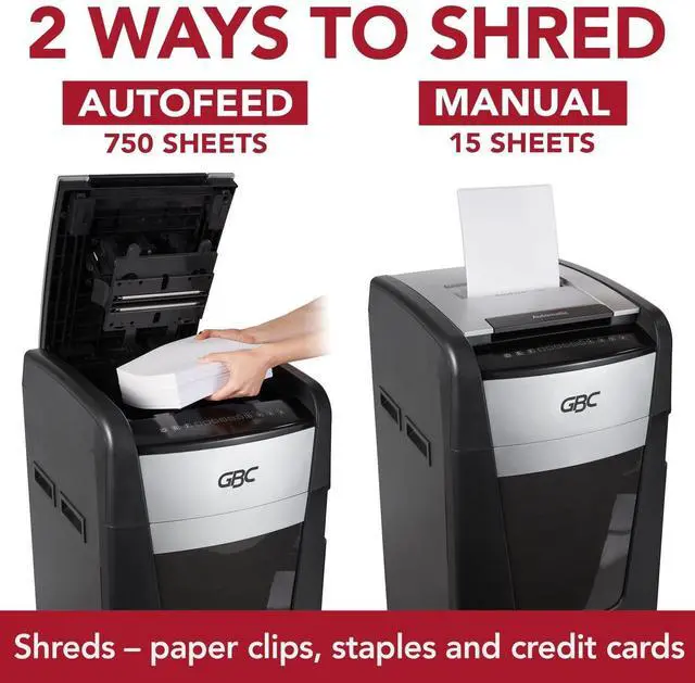 Spend less time shredding and more time on other tasks with the GBC AutoFeed+ 750M Micro-Cut Shredder. Our innovative auto-feeding technology takes the manual work out of shredding. Simply stack, shut and walk away. The shredder will shred your papers while you focus on your next project. Stack up to 750 sheets in the feeder for hands-free automatic shredding, or shred up to 15 sheets at once using the manual feeder slot. This shredder uses a micro-cut style shred, which provides P-5 Level Security. It safely shreds confidential or sensitive information, giving you peace of mind.