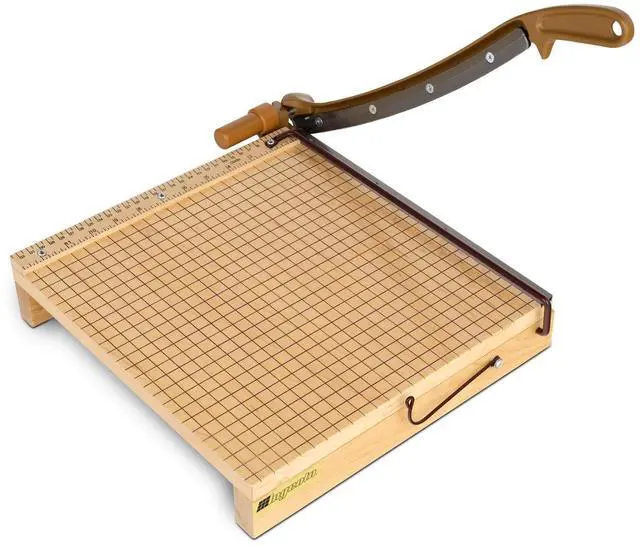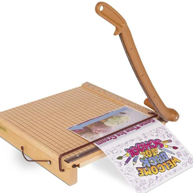From the ManufacturerSwingline ClassicCut Ingento Guillotine Trimmer, 12" Cut Length, 15 Sheet Capacity High quality cutting performanceSteel tension spring keeps guillotine blade arm in place in any position during active useThe ClassicCut Ingento Guillotine Trimmer is all about heavyweight paper cutting. A great tool for shared workspaces, this trimmer features a solid maple base and die-cast metal cutting arm. This model features a 12" cut length and the ability to cut 15 sheets of 20 lb. paper at a time. A steel tension spring keeps the cutting arm in place, no matter what position it is in.