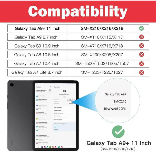 Compatibility:Only fit for Samsung Galaxy Tab A9 Plus 11 inch 2023 (Model: SM-X210/SM-X216/SM-X218 )Tablet, WILL NOT FIT ANY OTHER TABLETS. Please check your tablet model and confirm before placing your order.