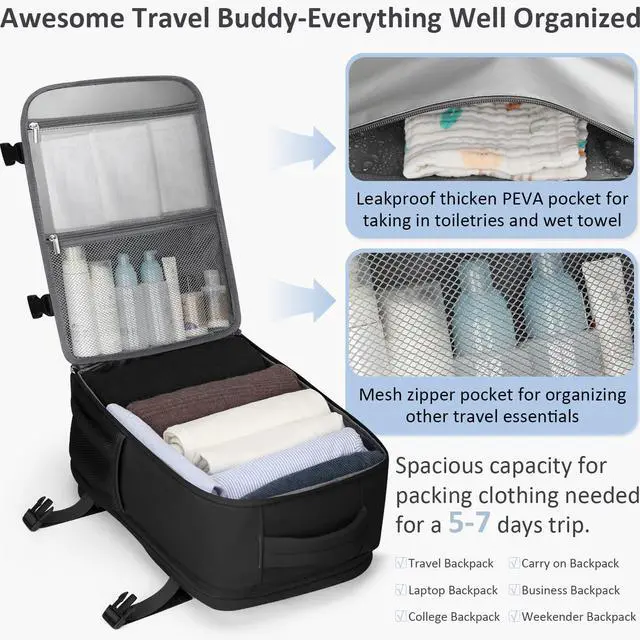 Travel Backpack Carry on Flight Approved: Tenot has designed this travel carry on backpack in two sizes to meet the needs of different users. There are 15.6 Inch carry on backpack and 17 inch personal item backpack, 180 degree open method helps you quickly pass through security. They dimensions also fit most airplanes' overhead and under the seat. You can choice the suitable capacity carry on travel backpack based on your needs, suitable for both short trips and long journeys