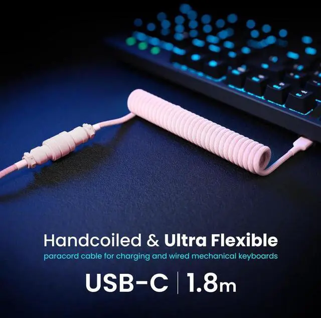 PWNAGE Ultra Custom Coiled Aviator USB C Cable for Gaming Keyboard, Double-Sleeved Mechanical Keyboard Cable with Detachable Metal Aviator, 1.8M USB-A to USB-C, Pink Color (Premium Pink)