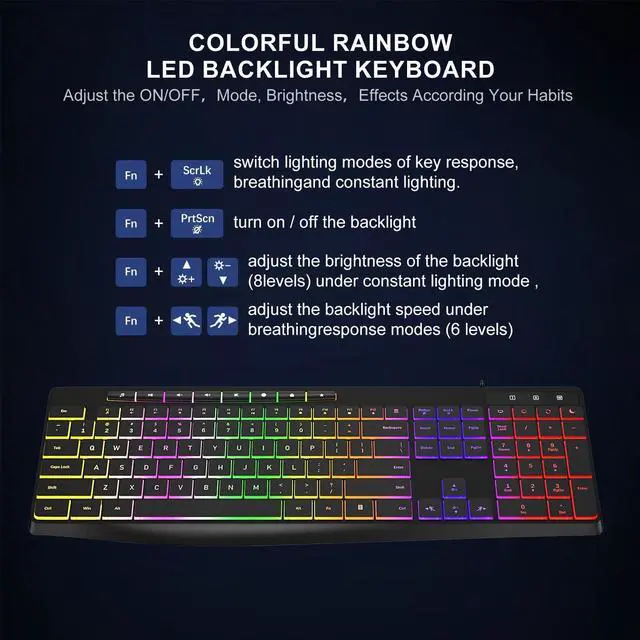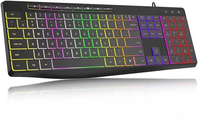 Gorgeous 7-Color Rainbow Backlit Keyboard, Light up In the DarkThe light up keyboard has a rainbow color backlight, making it more convenient to type in low-light environments. There are 3 Modes, 8 level Brightness and 6 level Speeds for your options. You can also turn on/off or adjust the Modes/Brightness/Speed of the backlight via FN + specific keys, allowing you to type efficiently in any lighting conditions., -. ^^ Low Profile and Neat, Silent and Soft This low profile keyboard features a silent design, making it extremely quiet when the keys are operated, allowing you to use it in a calm environment.