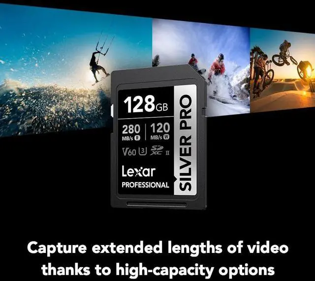 The Lexar Professional SILVER PRO SDXC UHS-II Card delivers up to 280MB/s read and 120MB/s write so you can capture stunning video and immaculate still imagesand save time transferring and backing up your files. Plus it comes in capacities up to 512GB so you have room to stay in the moment and keep shooting.
